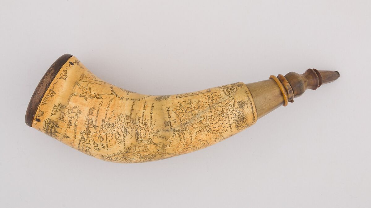 This powder horn is engraved with a map of forts and cities along the Hudson and Mohawk Rivers, and the arms of Great Britain.