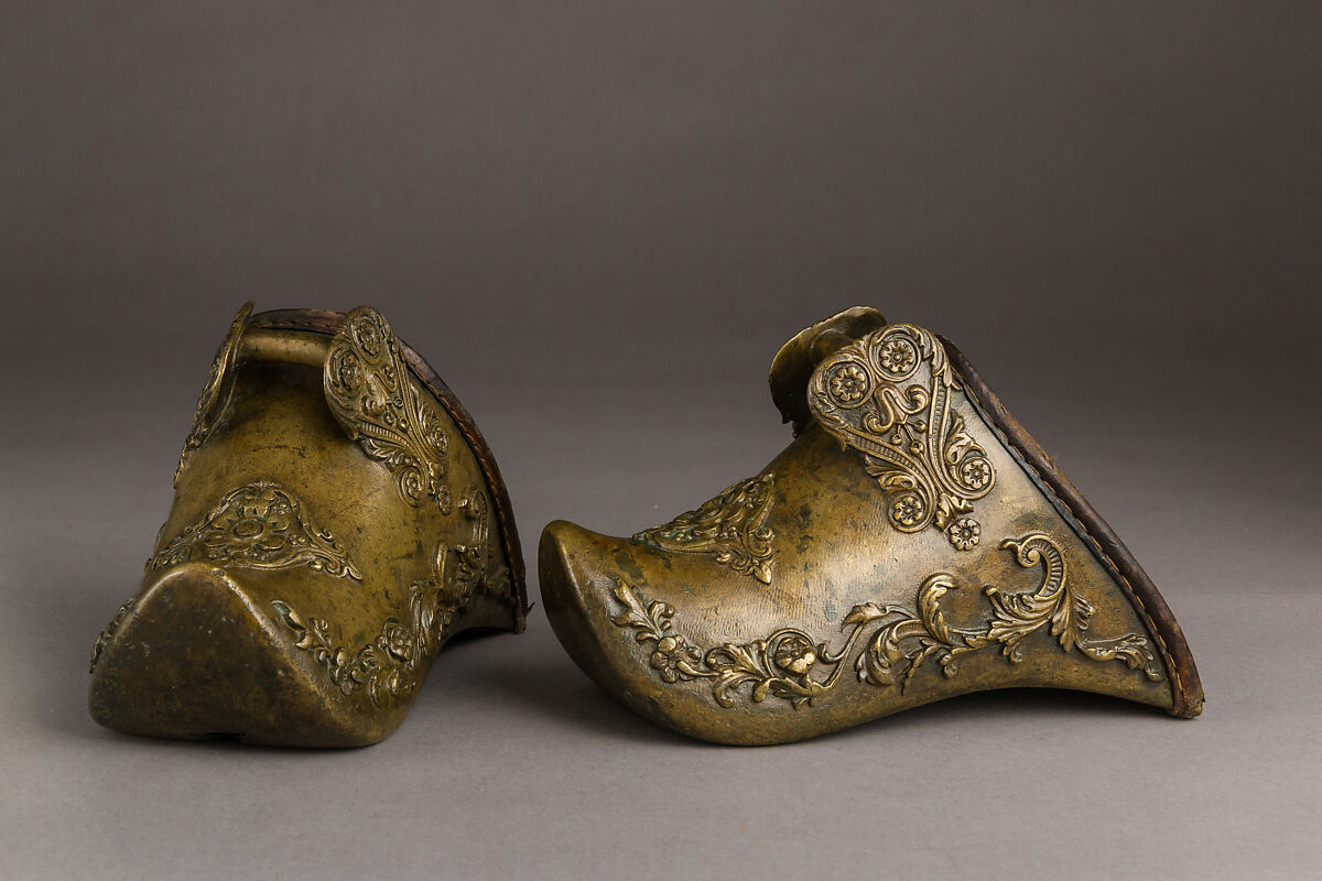 These slipper stirrups, cast in bronze, mimic in metal the shape of a leather boot. They are decorated with vegetal scrolls inspired by European Baroque and neo-classical designs, probably imitating contemporary embroidery. A leather lining is sewn on the edges by means of small holes pierced in the metal. The high quality of the metal casting is a direct inheritance of the metalworking skills displayed by Peruvian native populations before Spanish conquest.