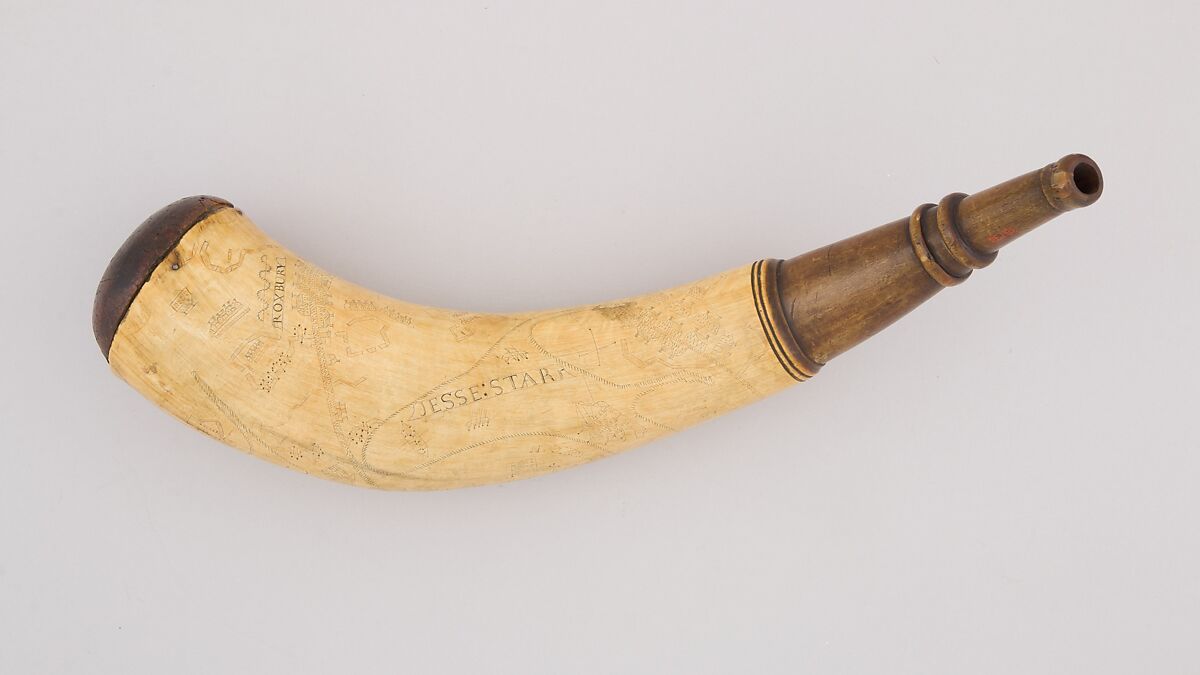 This powder horn is engraved with a map of Boston and the surrounding area.