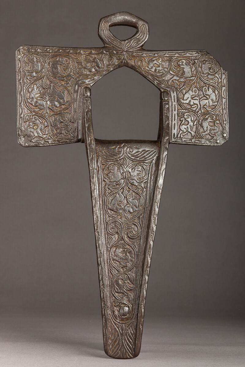 This heavy iron cross-form stirrup is decorated in low relief with vegetal scrolls inhabited by lions, dogs and birds, motifs possibly inspired by imported Chinese textiles and ivories. The silver nails on the corners of the side arms would have attached silver ornaments (now lost). The two elongated flaps are connected with a flat piece of iron pierced as a house façade motif showing a balcony, windows with vases, and vegetal scrolls inhabited by animals.