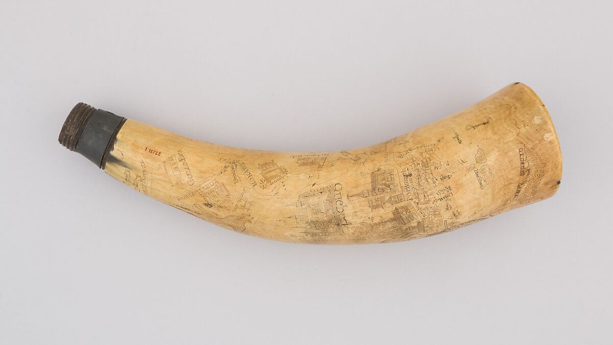 This powder horn is engraved with maps of the Atlantic coast and the Hudson, Mohawk, and St. Lawrence rivers. It is decorated with the royal coat of arms of Great Britain, a peacock and a compass.