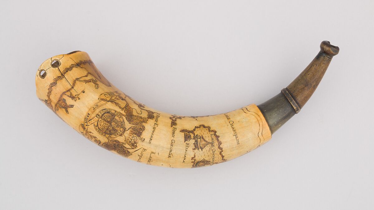 This powder horn is engraved with a map of the forts in the Hudson and Mohawk Valleys from Albany to the Great Lakes. It is also decorated with the royal arms of Great Britain.