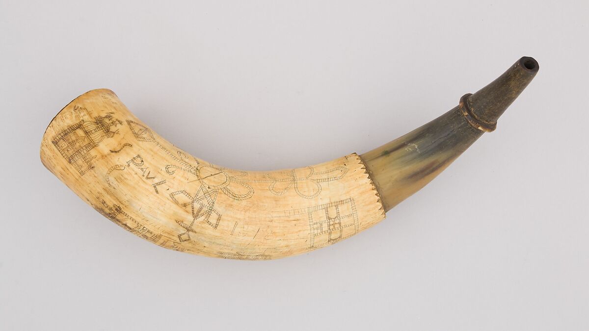 This powder horn is engraved with views of Saint Paul's Church and Fort Solom (?).