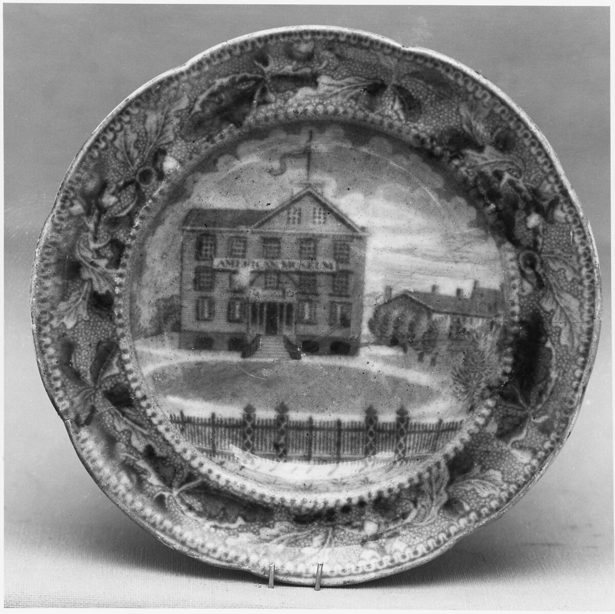 This blue and white transfer-printed earthenware cup plate made by the Staffordshire firm of Ralph Stevenson & Williams features a view of the American Museum in New York. The Museum building was erected in 1796 for use originally as an alms house. In 1817 it was taken over by the Museum, which was organized in 1790 by the Tammany Society and was initially called the Tammany Museum. Subsequently it became known as Scudder’s American Museum when it was managed by Dr. John Scudder (?–1821) from 1810 to 1821. The building also housed The New York Institution for meetings of the American Academy of Arts, the New-York Historical Society, the Literary and Philosophical Society and the Lyceum of Natural History. In 1830 the Museum moved to a new location at Broadway and Ann Street and the original building was converted to city offices until it burned in 1854. In an era when cultural institutions such as museums, theatres and concert halls were a relatively novel form of entertainment for the general public and represented new uses of architecture, they were among the more rare subjects chosen for transfer-printed wares. The view by Stevenson & Williams belongs to a series of approximately sixteen American views with standard acorn-and-oak-leaf borders produced for the United States export market. It was based on an anonymous lithograph titled "From an original drawing. New York City Hall Park. North End. 1825.,” which may have been after an 1822 drawing by New York artist Arthur J. Stansbury (1781–ca. 1845). The ceramic version omits a number of buildings appearing in the lithograph, leaving only the Museum and part of the original 1757 debtors' prison to the right. The American Wing’s collection contains additional pieces by Stevenson & Williams. Refer to the Dictionary for a definition of the term "transfer printing" and for information about Stevenson & Williams.