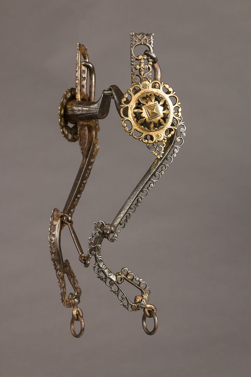 The pierced decoration of the bit and its bosses, giving a lace-like aspect to the metal, is typical of the decoration used by the spur makers in the South East of Germany in the 16th and 17th centuries. Despite their name, spur makers not only made spurs, but also all other small equestrian hardware like bits, stirrups, muzzles, cavessons or curry-combs, sometimes adorned with the same intricate decoration.