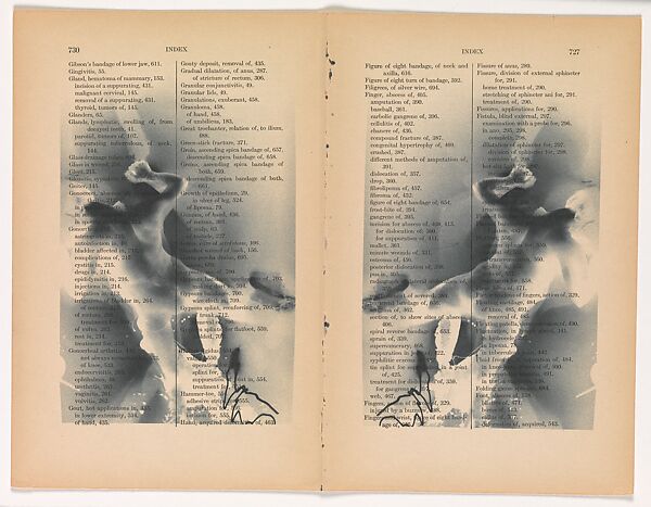 In this work, two mirrored, ghostly, negative images of a figure float across the open spread of a medical book index; the human figure is superimposed over a litany of diseases: Glass in wound, Goiter, Gonorrhea, Granuloma, Growth of epithelium, Gunshot wound. . . .