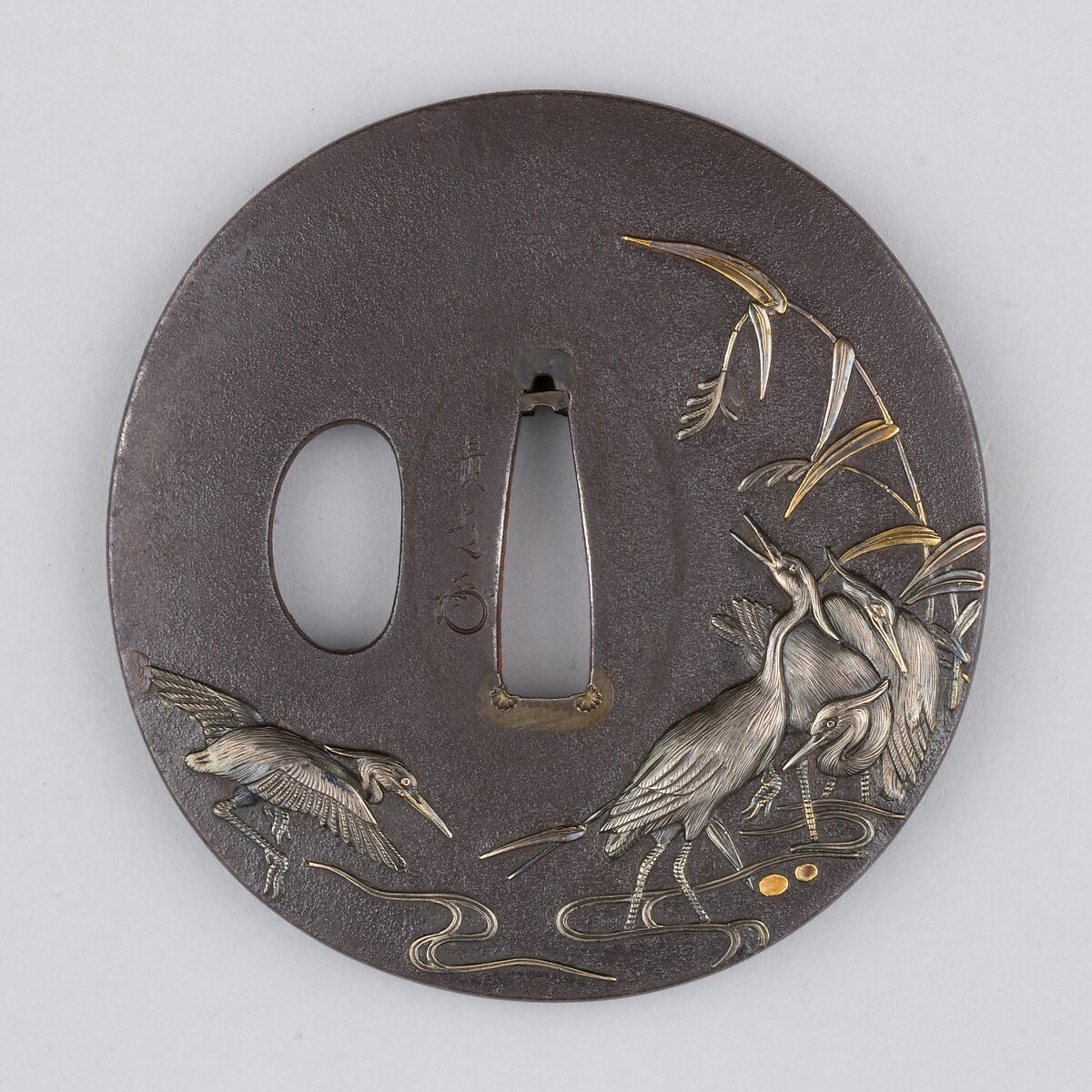 This tsuba features a design of herons and reeds.