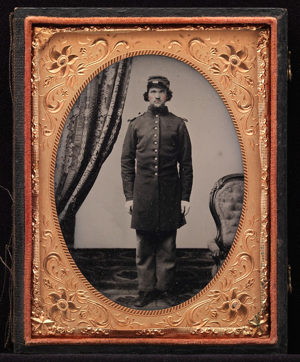 This formal portrait of a Union officer standing at attention in a handsomely appointed studio is typical of the thousands of similar likenesses of new recruits leaving home, perhaps for the first time in their lives. Dressed in a fitted single-breasted blue frock coat and light blue trousers, the soldier seems well prepared to meet whatever challenge is asked of him.