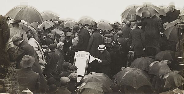 This work of art is currently on loan to the museum.Nicholls, a freelance press photographer who specialized in images of Edwardian high society, was typical of the first generation of professional photojournalists in his supple approach to photographic truth. If his camera failed to adequately capture his experience of an event, he had no qualms about combining elements from different negatives to create a more compelling image—a fact he rarely acknowledged in his captions. To enhance the impression of swarming crowds at Epsom Downs one rainy Derby Day, he cloned several groups of umbrella-toting spectators and pasted them into unoccupied areas in his original image.