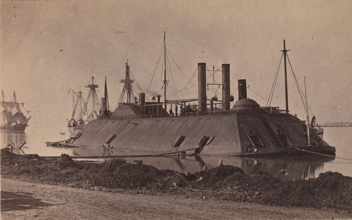 Armored war vessels made their first appearance during the Civil War and played an increasingly important strategic role for both North and South. When the war began, neither side anticipated how important would be control of the great Western Rivers. The U.S.S. Essex began its life in 1856 in New Albany, Indiana, as the steam ferry New Era. Purchased by the federal government in September 1861, it was soon lengthened, widened, reengineered, and clad with iron, which completely altered its appearance and made it one of the Navy’s most instrumental river gunboats. She appears here in Baton Rouge, Louisiana, taking on coal; in the background are sailing vessels in Admiral David Farragut’s fleet.