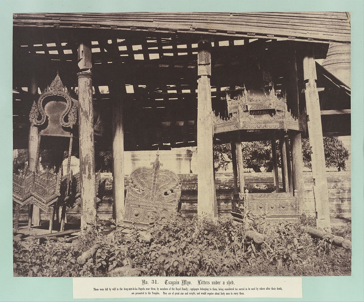 Litters, or palanquins, were used to transport members of the royal family or important monks. Their size, shape, and manner of decoration varied according to the status of the occupant. Tripe’s photograph of these abandoned litters hints at the British fascination with the ritual and regalia of Burmese court protocol.