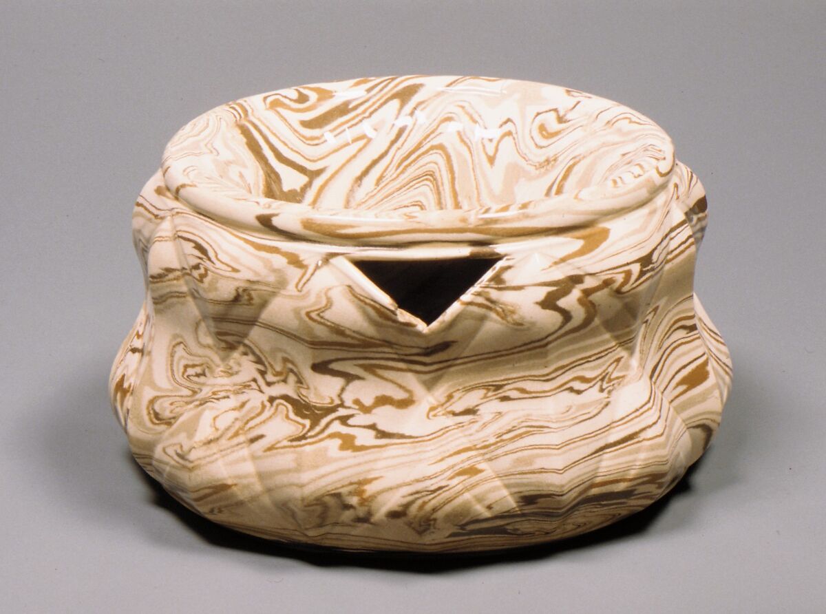 This cuspidor was produced in the "diamond" pattern and is made of "scroddled" or "lava" ware.