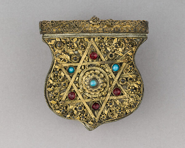 Patch boxes were worn on a belt and used to carry various accessories required by a gunman, such as spare flints and cleaning cloths. The hexagram in the center most likely represents the Seal of Solomon. According to legend, Solomon, renowned for his wisdom, received the Seal in the form of a signet ring directly from God to not only protect him, but to also give him the power to command animals, demons, and supernatural beings (jinn). The divinely-designed symbol became a popular apotropaic motif throughout the Islamic world and can be found on the surfaces of many objects.