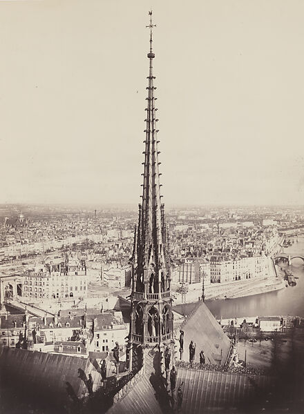 This work of art is currently on loan to the museum.Beginning in the 1830s, a heightened awareness of the precarious condition of France’s medieval monuments (many of which had been damaged during the French Revolution) fueled vast restoration projects across the country. Although Marville worked closely with Viollet-le-Duc, who oversaw renovations to Notre Dame, this view of the cathedral’s spire with the city spread out below was likely commissioned by the company that manufactured the lead work and many of the decorative ornaments on the cathedral’s roof.