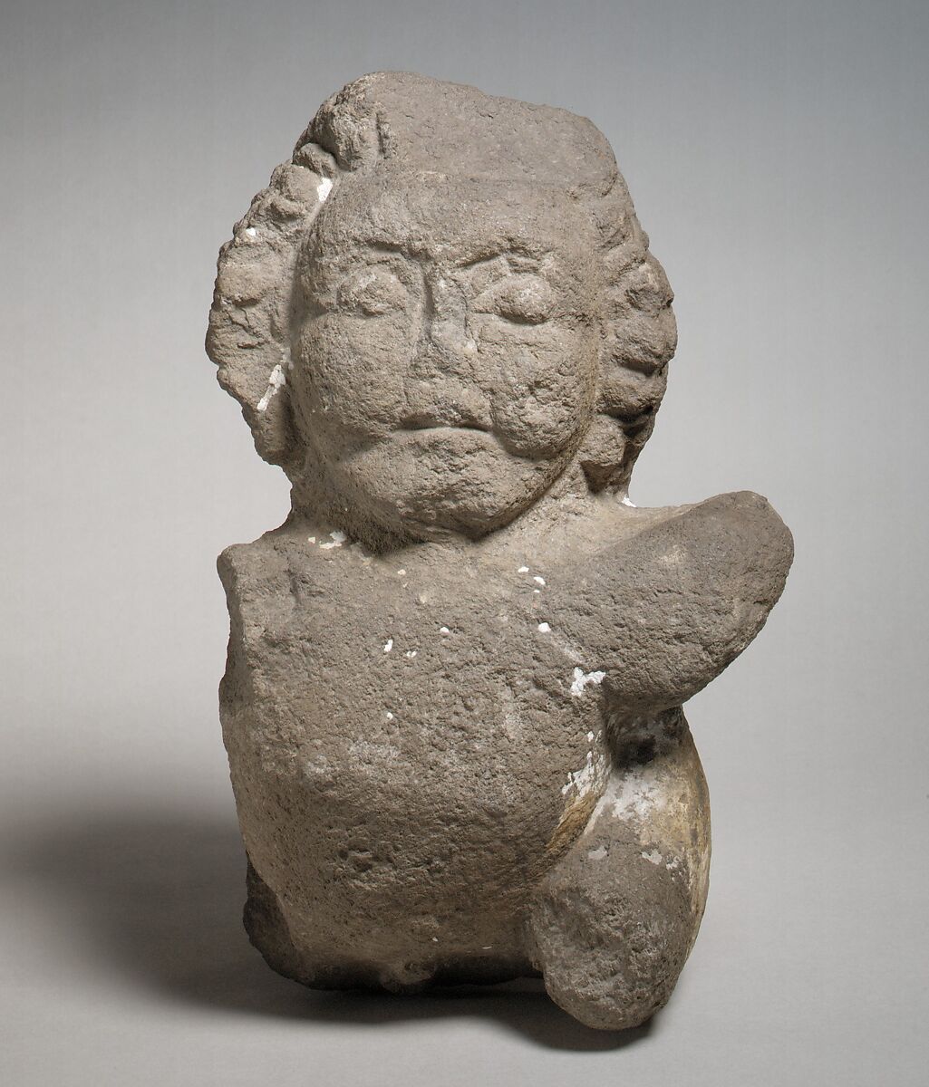 This small sculpture fragment exhibits European stylistic features in the treatment of the plump face and curly hair. The eyes and mouth in particular differ from Aztec practice, when they were usually shown as hollow recesses accommodating inlays.