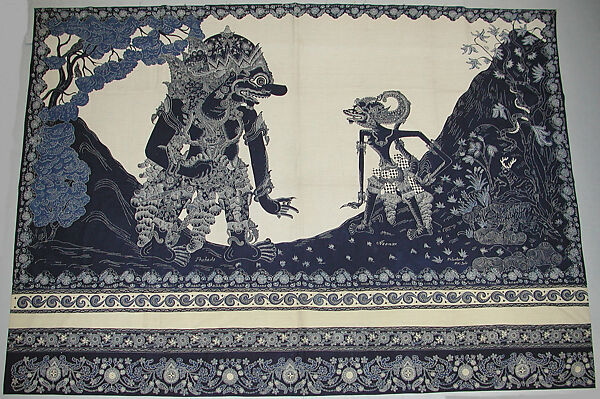 Dyed with deep blues on a pure white background to evoke the effect of a shadow-puppet performance, this textile portrays a scene from the Ramayana and was probably intended as a decorative wall hanging. At right is the monkey warrior Hanuman (known as Anoman in Javanese), who aids the epic’s hero, Rama, in rescuing his kidnapped wife. Anoman, his long tail curling up his back, confronts a giant being named Prahasto. The figures appear against an elaborate background of mountains, trees, and European-influenced images of deer and a snake, completely unlike the plain white screen used for (wayang kulit. This background was likely added to make the textile more appealing to a Western buyer (imagery from Javanese shadow puppetry was popular among Dutch visitors and colonial officials seeking a memento of their time in Indonesia). Produced with cloth manufactured in the Netherlands, decorated in Solo (now the Javanese city of Surakarta), and brought back to Holland, this textile exemplifies the roles that artworks, spices, and other commodities from Indonesia have played in the global economy for centuries.