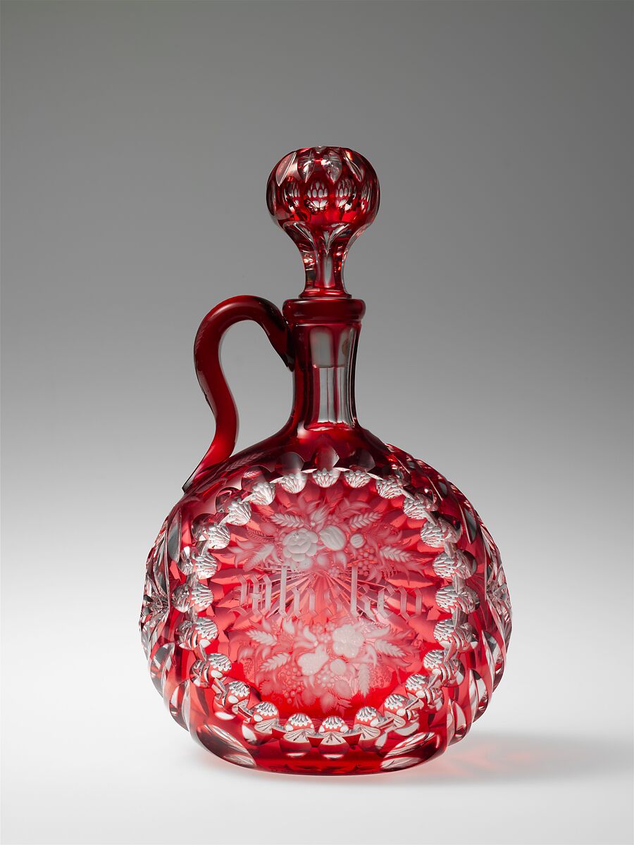 Richly colored glass in the Bohemian taste, ornamented with cutting and engraving, attracted the American public beginning in the mid-nineteenth century. This whiskey decanter, in a shape typical of the 1860s and 1870s, is distinguished by its brilliant faceting and detailed depiction of fruit, revealing the skill of the engraver. As a testament to its quality, Lapham signed and dated the work. The decanter was owned by William Kern, a glassworker who was presented with over fifty pieces of blown and engraved glass upon his retirement from the Boston and Sandwich Glass Company in 1867, after twenty-two years of employment.