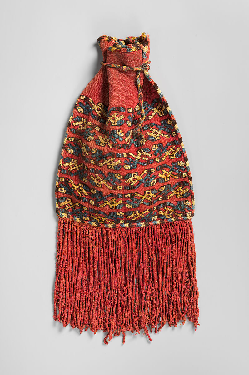 The arid conditions of the desert on the south coast of Peru are ideal for the preservation of organic materials such as textiles. This bag, used for carrying coca leaves, was made by weavers of the Nasca culture that dominated the coastal valleys of southern Peru. The textile was made as a single piece using red thread with discontinuous weaving at one end where the unwoven ends of the warps formed a fringe. The seven interlocking bands in yellow, blue and black forming animal faces with red eyes, were embroidered onto the red base cloth and the weaving folded in half with the unwoven warps forming the tassels. A cross-knit loop stich was used to finish the edges. A cord for closing the bag was attached to the top. This fabric was made during a period when the Nasca culture began to manifest influences from the Wari empire, which originated in the Ayacucho region in the highlands and later dominated most of the coast of Peru. Wari traits are evident in the pattern of the embroidered design and the exclusive use of camelid thread, as llamas and alpacas were not native to the coast.