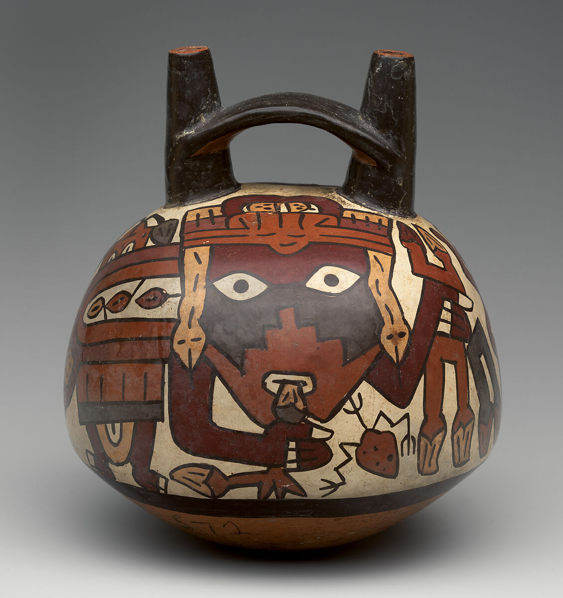 Nasca ceramicists of Peru’s South Coast produced refined polychrome vessels in the early and middle centuries of the first millennium of the Common Era. Nasca artists depicted animals, plants, people, and supernatural beings in great detail, including distinctive hairstyles, nose ornaments, and elaborate clothing. These fine polychrome ceramics were used in ceremonies attended by hundreds of people, who transported these vessels back home as prestige items and as carriers of religious knowledge.