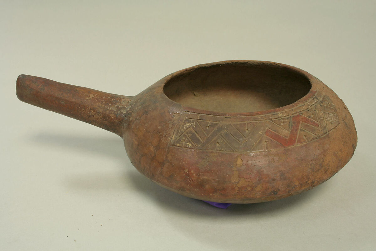 This vessel with a handle is from the Paracas culture of the south coast of Peru (5th – 2nd centuries B.C.) has a round body with long handle. It contains decorative elements created using two different techniques. The first is a band of geometric design along part of the mouth of the vessel, defined by making incisions prior to firing, then applying colored paint after firing. This technique is called post-fire resin painting. The paint was made by mixing mineral pigments with plant resin to adhere to the surface of the ceramic. The bright colors often used with this technique are red, yellow, brown, black, and white. Scholars have suggested that the usage of certain pigments may indicate access to, and circulation of, the various resources needed in paint production which came from areas outside the Paracas region, which may be indicative of trade networks. Post-fired painting is a technique noted early in Paracas society.