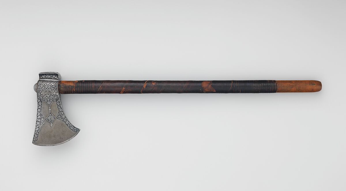 As the name implies, small axes of this type, tabarzin in Persian, were carried beneath a horseman’s saddle, ready for use in handto-hand combat. The blade of this example is forged from crucible (“watered”) steel and is delicately chiseled with foliage and splitleaf arabesques that point to an eighteenth-century date.