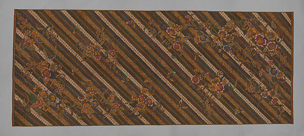 In this example European-inspired butterflies and flowers appear against a background of diagonal bands composed of indigenous motifs, including the four-lobed kawung -- one of the oldest batik motifs, once restricted solely to the royal courts of central Java. The result is a striking composition as colorful and exuberant as the war years were grim.