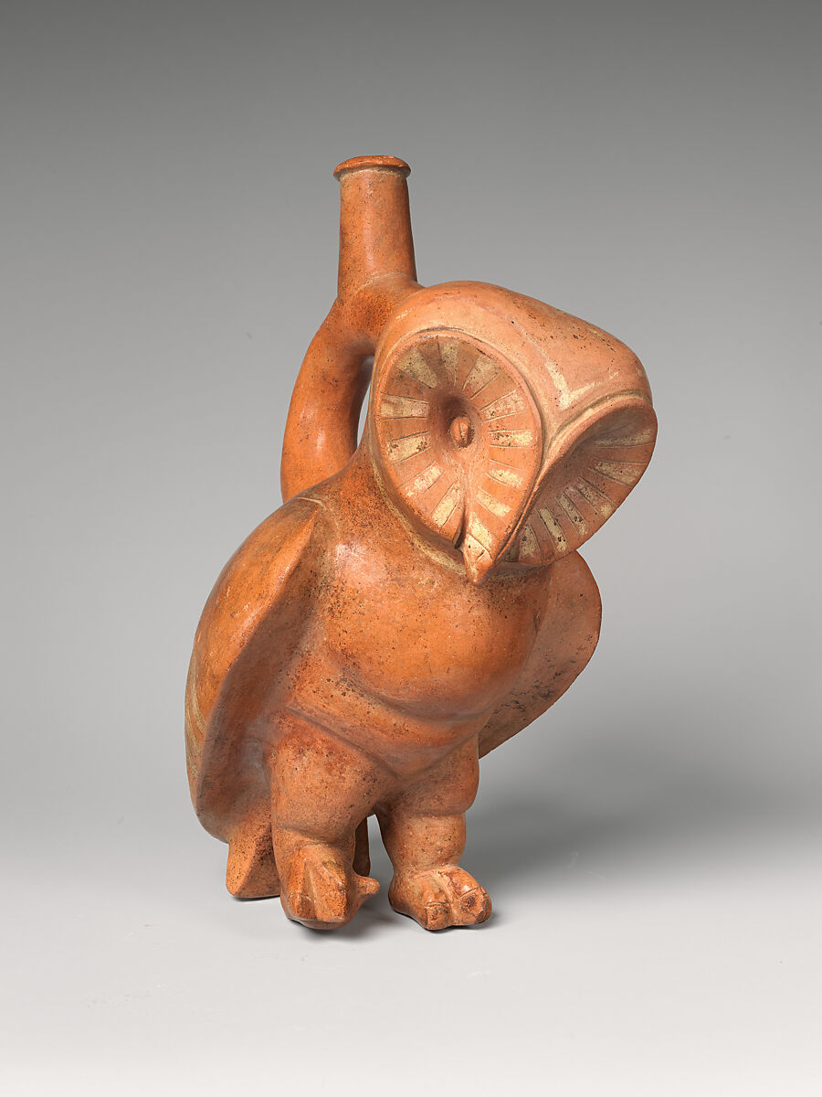 Moche ceramists rendered naturalistic details of humans, animals, and plants with great anatomical precision. Exact species and even historical individuals can be recognized in sculptural images depicted with a high degree of realism. In Moche religion and iconography, birds of prey include falcons, eagles, condors, vultures, and owls. Naturalistic or anthropomorphized birds of prey perform a variety of ritual activities related to their natural behavior such as battles, hunts, and sacrifices. Perhaps because they are nocturnal, owls seem to be closely related to the funerary domain. Anthropomorphized owls prepare bodies and offerings for burials and also carry deceased warriors to the world of the dead. Many species of owls living in the desert environment of the Peruvian north coast are represented by Moche ceramists. This vessel probably shows a Tyto alba, recognizable by the heart-shaped facial disk and the absence of ear tufts.
