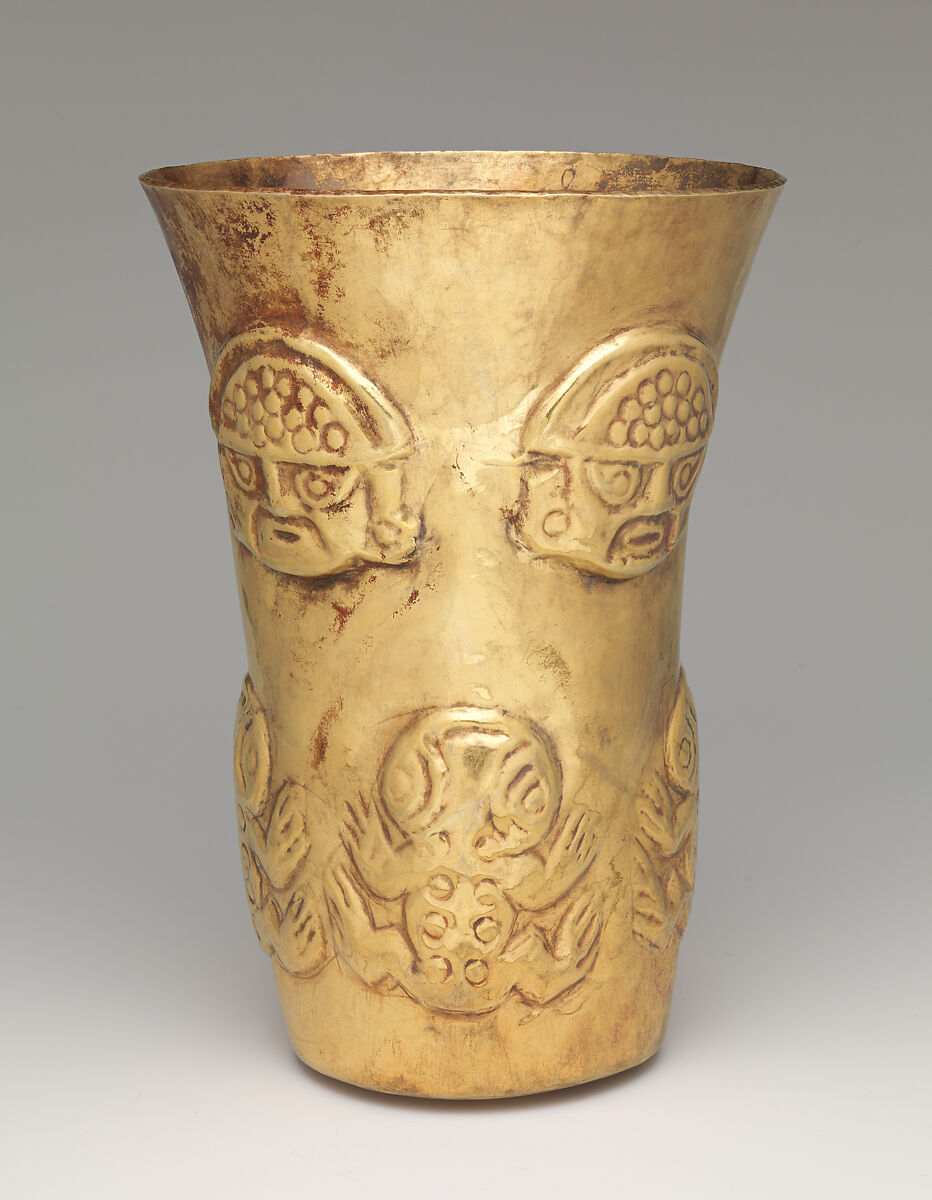 This flared beaker likely once held ritual liquids, possibly chicha, a fermented corn beverage imbibed widely throughout what is now South America. Created by artists of the Lambayeque (also known as Sicán) culture, the vessel was fashioned from a blank or ingot that was first hammered into a thin sheet then shaped over a wooden mold. Such standardization allowed the Lambayeque to develop a large-scale industry around metalworking on the northern Pacific coast of Peru, so much so that a single high-status tomb could feature hundreds of metal objects.