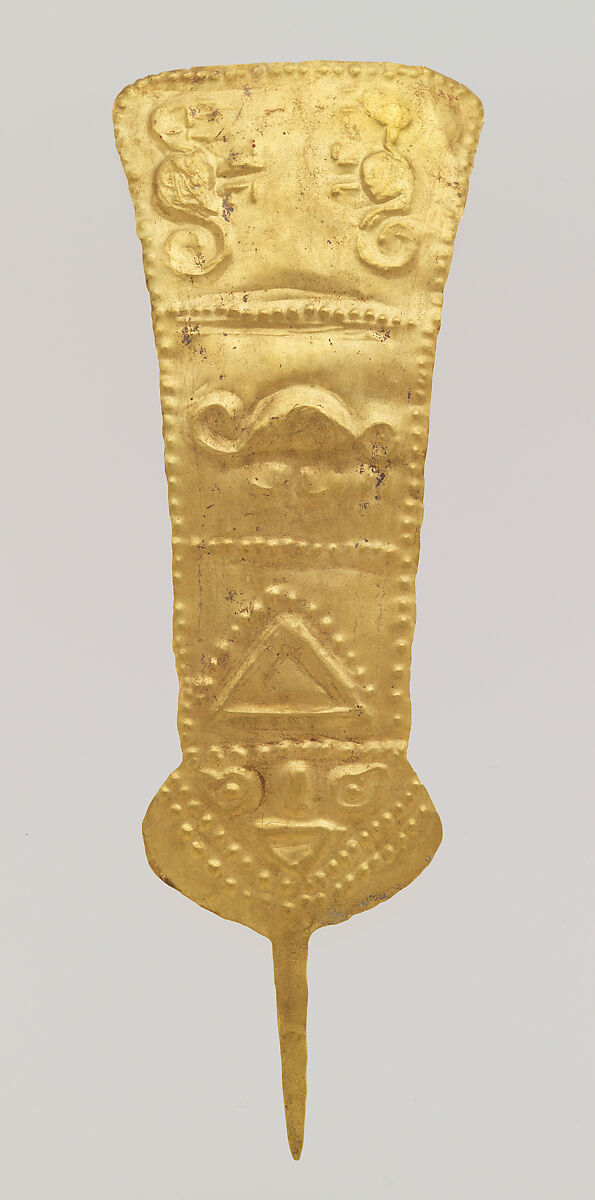 Ornamental plumes made of hammered gold sheet are known from several periods and places in ancient Peru. In shape, they emulate feathers—a material that was perhaps even more esteemed than gold itself. Likely intended to be affixed to a headdress, also of gold sheet, or another material, such ornaments distinguished curacas (leaders) from other members of a community. This plume and its mate (66.196.46) were embossed with animal forms on the top and middle sections and a human face with comma-shaped eyes on the bottom, separated by lines of raised circles.