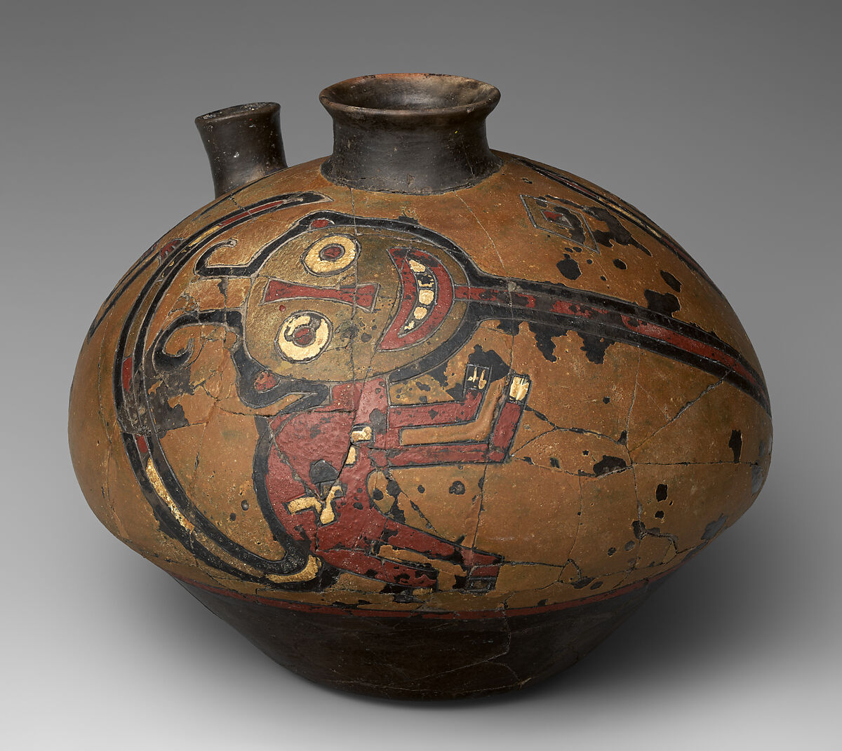 Paracas-style ceramics are characterized by their vibrant and lustrous colors. Combining mostly mineral pigments with a binding agent, artists created paints that were applied on the surface of the pottery post firing (Kriss et al., 2018). At a time when most ceramics in the Central Andes were of muted colors, the Paracas palette was a significant innovation. After 500 BCE, ceramic assemblages also became more diverse. A new type of necked jar, for example, became widely popular in the region. This jar is one of the new forms in which the vessel has a lateral spout, perhaps to facilitate pouring.