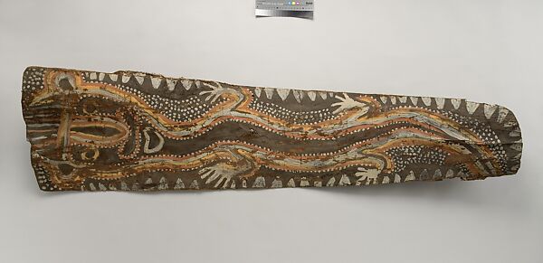 This panel is one of over 270 original paintings commissioned from Kwoma artists in the village of Mariwai in 1970 and 1973 by Douglas Newton, the first curator of Oceanic art in the Department of the Arts of Africa, Oceania and the Americas. Once completed, they were shipped to New York and installed in the galleries. In 2007, when the Oceania galleries at the Metropolitan Museum were renovated, the panels were attached to a new superstructure. Although less steeply pitched than the Kwoma houses found in villages today, the installation evokes the essential form of a ceremonial house ceiling. Together these suspended panels form an impressive and spectacular installation in the Metropolitan Museum which, at 80.4 feet (24.5 meters) end-to-end, is the largest contemporary art installation in the museum.