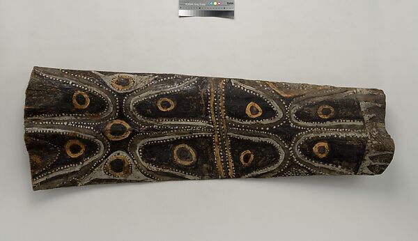 This panel is one of over 270 original paintings commissioned from Kwoma artists in the village of Mariwai in 1970 and 1973 by Douglas Newton, the first curator of Oceanic art in the Department of the Arts of Africa, Oceania and the Americas. Once completed, they were shipped to New York and installed in the galleries. In 2007, when the Oceania galleries at the Metropolitan Museum were renovated, the panels were attached to a new superstructure. Although less steeply pitched than the Kwoma houses found in villages today, the installation evokes the essential form of a ceremonial house ceiling. Together these suspended panels form an impressive and spectacular installation in the Metropolitan Museum which, at 80.4 feet (24.5 meters) end-to-end, is the largest contemporary art installation in the museum.
