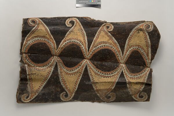 This panel is one of over 270 original paintings commissioned from Kwoma artists in the village of Mariwai in 1970 and 1973 by Douglas Newton, the first curator of Oceanic art in the Department of the Arts of Africa, Oceania and the Americas. Once completed, they were shipped to New York and installed in the galleries. In 2007, when the Oceania galleries at the Metropolitan Museum were renovated, the panels were attached to a new superstructure. Although less steeply pitched than the Kwoma houses found in villages today, the installation evokes the essential form of a ceremonial house ceiling. Together these suspended panels form an impressive and spectacular installation in the Metropolitan Museum which, at 80.4 feet (24.5 meters) end-to-end, is the largest contemporary art installation in the museum.