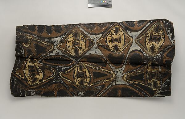 This panel is one of over 270 original paintings commissioned from Kwoma artists in the village of Mariwai in 1970 and 1973 by Douglas Newton, the first curator of Oceanic art in the Department of the Arts of Africa, Oceania and the Americas. Once completed, they were shipped to New York and installed in the galleries. In 2007, when the Oceania galleries at the Metropolitan Museum were renovated, the panels were attached to a new superstructure. Although less steeply pitched than the Kwoma houses found in villages today, the installation evokes the essential form of a ceremonial house ceiling. Together these suspended panels form an impressive and spectacular installation in the Metropolitan Museum which, at 80.4 feet (24.5 meters) end-to-end, is the largest contemporary art installation in the museum.