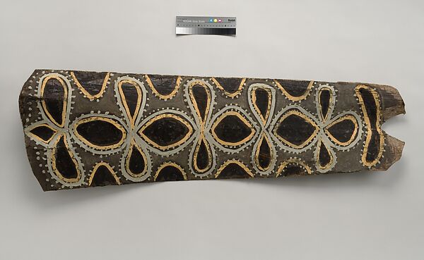 This panel is one of over 270 original paintings commissioned from Kwoma artists in the village of Mariwai in 1970 and 1973 by Douglas Newton, the first curator of Oceanic art in the Department of the Arts of Africa, Oceania and the Americas. Once completed, they were shipped to New York and installed in the galleries. In 2007, when the Oceania galleries at the Metropolitan Museum were renovated, the panels were attached to a new superstructure. Although less steeply pitched than the Kwoma houses found in villages today, the installation evokes the essential form of a ceremonial house ceiling. Together these suspended panels form an impressive and spectacular installation in the Metropolitan Museum which, at 80.4 feet (24.5 meters) end-to-end, is the largest contemporary art installation in the museum.