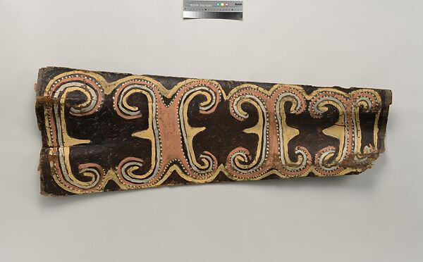 This panel is one of over 270 original paintings commissioned from Kwoma artists in the village of Mariwai in 1970 and 1973 by Douglas Newton, the first curator of Oceanic art in the Department of the Arts of Africa, Oceania and the Americas. Once completed, they were shipped to New York and installed in the galleries. In 2007, when the Oceania galleries at the Metropolitan Museum were renovated, the panels were attached to a new superstructure. Although less steeply pitched than the Kwoma houses found in villages today, the installation evokes the essential form of a ceremonial house ceiling. Together these suspended panels form an impressive and spectacular installation in the Metropolitan Museum which, at 80.4 feet (24.5 meters) end-to-end, is the largest contemporary art installation in the museum.