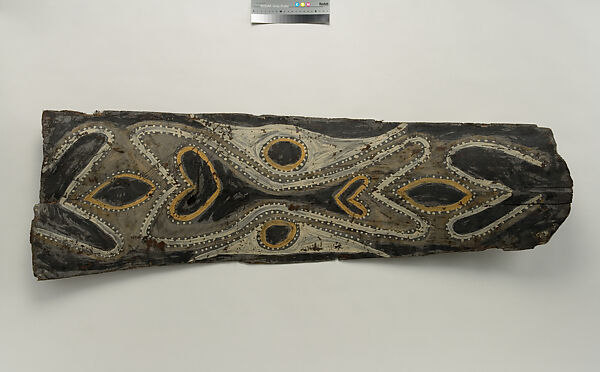 This panel is one of over 270 original paintings commissioned from Kwoma artists in the village of Mariwai in 1970 and 1973 by Douglas Newton, the first curator of Oceanic art in the Department of the Arts of Africa, Oceania and the Americas. Once completed, they were shipped to New York and installed in the galleries. In 2007, when the Oceania galleries at the Metropolitan Museum were renovated, the panels were attached to a new superstructure. Although less steeply pitched than the Kwoma houses found in villages today, the installation evokes the essential form of a ceremonial house ceiling. Together these suspended panels form an impressive and spectacular installation in the Metropolitan Museum which, at 80.4 feet (24.5 meters) end-to-end, is the largest contemporary art installation in the museum.