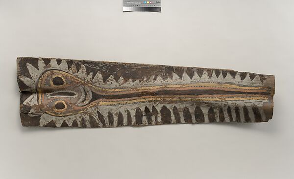 This panel is one of over 270 original paintings commissioned from Kwoma artists in the village of Mariwai in 1970 and 1973 by Douglas Newton, the first curator of Oceanic art in the Department of the Arts of Africa, Oceania and the Americas. Once completed, they were shipped to New York and installed in the galleries. In 2007, when the Oceania galleries at the Metropolitan Museum were renovated, the panels were attached to a new superstructure. Although less steeply pitched than the Kwoma houses found in villages today, the installation evokes the essential form of a ceremonial house ceiling. Together these suspended panels form an impressive and spectacular installation in the Metropolitan Museum which, at 80.4 feet (24.5 meters) end-to-end, is the largest contemporary art installation in the museum.
