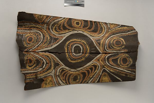 This panel is one of over 270 original paintings commissioned from Kwoma artists in the village of Mariwai in 1970 and 1973 by Douglas Newton, the first curator of Oceanic art in the Department of the Arts of Africa, Oceania and the Americas. Once completed, they were shipped to New York and installed in the galleries. In 2007, when the Oceania galleries at the Metropolitan Museum were renovated, the panels were attached to a new superstructure. Although less steeply pitched than the Kwoma houses found in villages today, the installation evokes the essential form of a ceremonial house ceiling. Together these suspended panels form an impressive and spectacular installation in the Metropolitan Museum which, at 80.4 feet (24.5 meters) end-to-end, is the largest contemporary art installation in the museum.