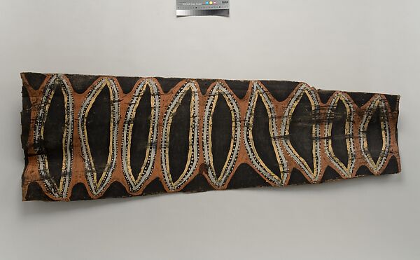 This panel is one of over 270 original paintings commissioned from Kwoma artists in the village of Mariwai in 1970 and 1973 by Douglas Newton, the first curator of Oceanic art in the Department of the Arts of Africa, Oceania and the Americas. Once completed, they were shipped to New York and installed in the galleries. In 2007, when the Oceania galleries at the Metropolitan Museum were renovated, the panels were attached to a new superstructure. Although less steeply pitched than the Kwoma houses found in villages today, the installation evokes the essential form of a ceremonial house ceiling. Together these suspended panels form an impressive and spectacular installation in the Metropolitan Museum which, at 80.4 feet (24.5 meters) end-to-end, is the largest contemporary art installation in the museum.