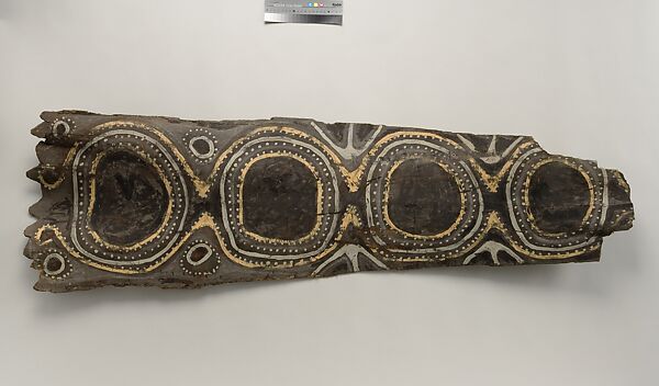 This panel is one of over 270 original paintings commissioned from Kwoma artists in the village of Mariwai in 1970 and 1973 by Douglas Newton, the first curator of Oceanic art in the Department of the Arts of Africa, Oceania and the Americas. Once completed, they were shipped to New York and installed in the galleries. In 2007, when the Oceania galleries at the Metropolitan Museum were renovated, the panels were attached to a new superstructure. Although less steeply pitched than the Kwoma houses found in villages today, the installation evokes the essential form of a ceremonial house ceiling. Together these suspended panels form an impressive and spectacular installation in the Metropolitan Museum which, at 80.4 feet (24.5 meters) end-to-end, is the largest contemporary art installation in the museum.