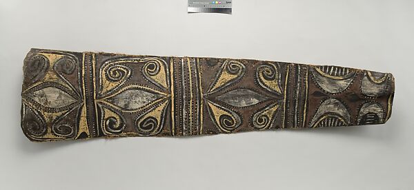 This panel is one of over 270 original paintings commissioned from Kwoma artists in the village of Mariwai in 1970 and 1973 by Douglas Newton, the first curator of Oceanic art in the Department of the Arts of Africa, Oceania and the Americas. Once completed, they were shipped to New York and installed in the galleries. In 2007, when the Oceania galleries at the Metropolitan Museum were renovated, the panels were attached to a new superstructure. Although less steeply pitched than the Kwoma houses found in villages today, the installation evokes the essential form of a ceremonial house ceiling. Together these suspended panels form an impressive and spectacular installation in the Metropolitan Museum which, at 80.4 feet (24.5 meters) end-to-end, is the largest contemporary art installation in the museum.