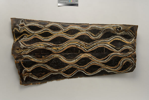This panel is one of over 270 original paintings commissioned from Kwoma artists in the village of Mariwai in 1970 and 1973 by Douglas Newton, the first curator of Oceanic art in the Department of the Arts of Africa, Oceania and the Americas. Once completed, they were shipped to New York and installed in the galleries. In 2007, when the Oceania galleries at the Metropolitan Museum were renovated, the panels were attached to a new superstructure. Although less steeply pitched than the Kwoma houses found in villages today, the installation evokes the essential form of a ceremonial house ceiling. Together these suspended panels form an impressive and spectacular installation in the Metropolitan Museum which, at 80.4 feet (24.5 meters) end-to-end, is the largest contemporary art installation in the museum.