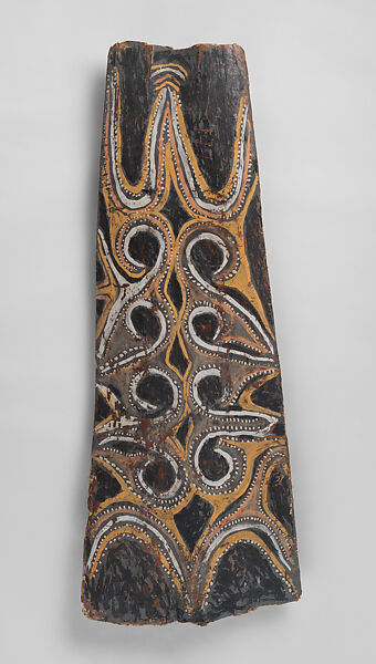 This panel is one of over 270 original paintings commissioned from Kwoma artists in the village of Mariwai in 1970 and 1973 by Douglas Newton, the first curator of Oceanic art in the Department of the Arts of Africa, Oceania and the Americas. Once completed, they were shipped to New York and installed in the galleries. In 2007, when the Oceania galleries at the Metropolitan Museum were renovated, the panels were attached to a new superstructure. Although less steeply pitched than the Kwoma houses found in villages today, the installation evokes the essential form of a ceremonial house ceiling. Together these suspended panels form an impressive and spectacular installation in the Metropolitan Museum which, at 80.4 feet (24.5 meters) end-to-end, is the largest contemporary art installation in the museum.