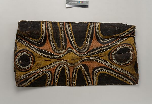 This panel is one of over 270 original paintings commissioned from Kwoma artists in the village of Mariwai in 1970 and 1973 by Douglas Newton, the first curator of Oceanic art in the Department of the Arts of Africa, Oceania and the Americas. Once completed, they were shipped to New York and installed in the galleries. In 2007, when the Oceania galleries at the Metropolitan Museum were renovated, the panels were attached to a new superstructure. Although less steeply pitched than the Kwoma houses found in villages today, the installation evokes the essential form of a ceremonial house ceiling. Together these suspended panels form an impressive and spectacular installation in the Metropolitan Museum which, at 80.4 feet (24.5 meters) end-to-end, is the largest contemporary art installation in the museum.