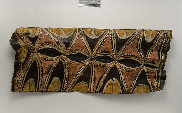 This panel is one of over 270 original paintings commissioned from Kwoma artists in the village of Mariwai in 1970 and 1973 by Douglas Newton, the first curator of Oceanic art in the Department of the Arts of Africa, Oceania and the Americas. Once completed, they were shipped to New York and installed in the galleries. In 2007, when the Oceania galleries at the Metropolitan Museum were renovated, the panels were attached to a new superstructure. Although less steeply pitched than the Kwoma houses found in villages today, the installation evokes the essential form of a ceremonial house ceiling. Together these suspended panels form an impressive and spectacular installation in the Metropolitan Museum which, at 80.4 feet (24.5 meters) end-to-end, is the largest contemporary art installation in the museum.