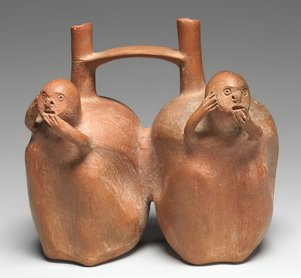 Many Topará vessels were shaped in the form of gourds (MMA 63.232.55), others in the shape of animals. This bottle was created by joining hollow containers shaped like individual monkeys. The two spouts were connected by a flat, horizontal handle. This vessel type, known as a spout-and-bridge bottle, was the South Coast’s signature shape for the following millennium. The monkeys’ round, flat faces feature wide-open circular eyes and a barely open mouth, giving the impression of surprise or distress. Clay appliqués were used to create little noses. Their right hands touch their right ear while the left one touches the animal’s mouth, in a gesture similar to that found in another Topará monkey vessel (MMA 62.266.63).