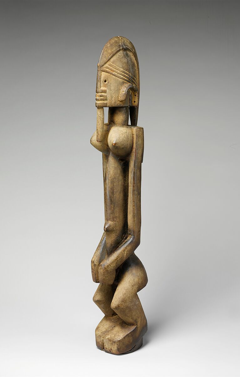This female figure is one of about a dozen works that have been attributed to the same Dogon artist, identified by art historians as the "Master of Ogol" after a village in the Sanga region where a work in this corpus was collected in 1935. The shape of the head and facial features of works created by the Master are distinctive for the helmetlike head and the unique horizontally stacked mouth-nostrils-chin ensemble, closely framed by the strong vertical nose and cylindrical lip ornament. Works identified as dege dal nda, or "sculptures of the terrace," were only removed from storage for the funerals of prominent men, on which occasions they were dressed and displayed on the rooftop terrace of the deceased. Such figures may also have been part of altars established for women who had died during childbirth.