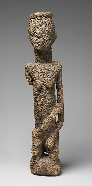 In the absence of scientific testing, this work is broadly dated to sometime between the 15th and early 20th centuries and is attributed to the Tellem-Dogon peoples. European authors have conducted research among the Dogon peoples in the Bandiagara Escarpment (Mali) since 1903, when sculptures such as this started to enter Western collections. In their oral accounts to Western scholars, the Dogon recounted that they had migrated to the region in the 15th century. At their arrival, they discovered that another population, the “Tellem”— literally, ‘we have found them here’—had lived there since the 11th century and eventually disappeared for unknown reasons. More recently, ethnographic and archeological investigations have confirmed the existence of a ‘Tellem’ population, one that pre-dated and was distinguished from the Dogon. Through radiocarbon analysis of objects and burial sites, specialist Rogier Bedaux delineated a chronology of the populations who lived in the Bandiagara Escarpment: Tellem (11th-15th century), Tellem-Dogon (15th-17th century), Dogon (17th-20th century). While this specific sculpture has yet to undergo scientific testing, it probably belongs to the second phase (Tellem-Dogon) when these two groups lived side-by-side influencing each other’s customs and artistic practices. Indeed, this sculpture displays formal qualities found in both Tellem and Dogon works. For instance, its patina and stylized forms can be seen in earlier Tellem objects, whereas the motif of the kneeling woman with thin limbs recalls later Dogon statuaries.