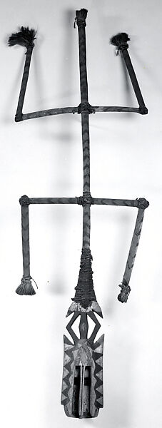 Dogon masks such as this sim mask are worn primarily at commemorative rituals for Dogon men. The face of the sim mask is typical of many Dogon wooden masks. A rectangular box with an arched forehead, it has two deeply hollowed channels in front. The edges of the box extend upward at the top, forming small "ears." A pierced, diamond-shaped section links the mask with its tall superstructure, which is lashed to it with strips of hide. The mask's face is said to represent an antelope, while the top depicts a tall, thin spirit in human form whose body is constantly swaying. This sim mask is unusual in that the vertical elements attached to the ends of the lower crossbar point downward; in most examples they point upward like those on the crossbar above. The choreography of the sim mask's movements is among the most strenuous of Dogon dances, requiring the performer to swing the mask around the axis of his body, and to beat the ground with the tip of the superstructure.